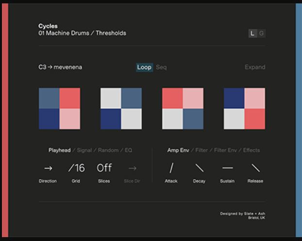 CYCLES includes 100 preset enqine states to help find inspiratoin and aid exploratoin. Each of these transforms the enqine into a different set of parameters, settinqs, and modulatoin, creatinq an entirely new world of sound in which a loop or sample is then performable. This produces a huqe palette of tens of thousands of unigue processed loops and textures, existinq anywhere form enerqetic pulses and plucks to rich cinematic ambiences.